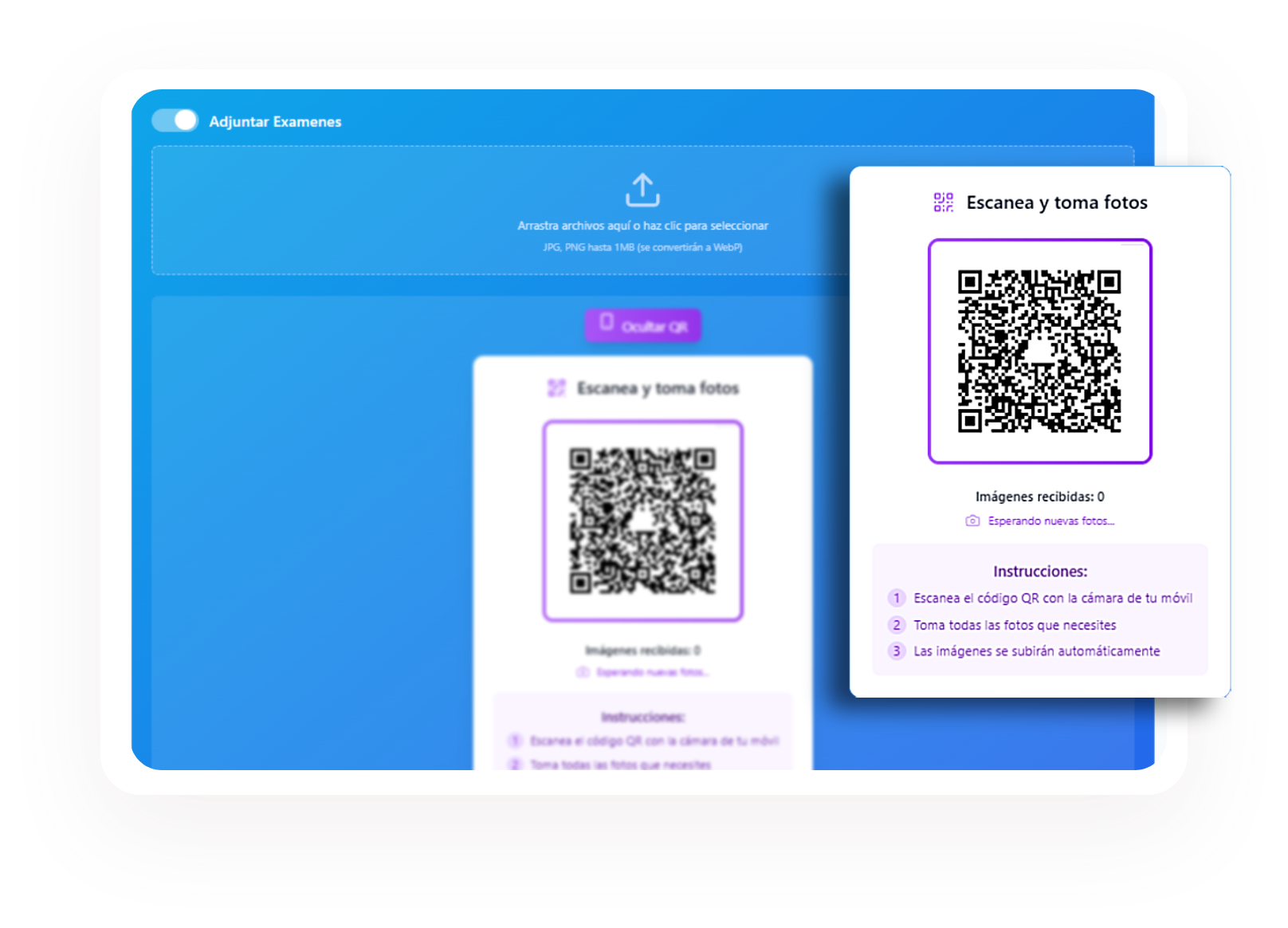 Os médicos podem escanear um código QR no computador para fotografar pelo celular e anexar exames diretamente à consulta. Também é possível anexar pela tablet ou celular sem precisar escanear. Os arquivos ficam na nuvem e acessíveis no histórico do paciente.